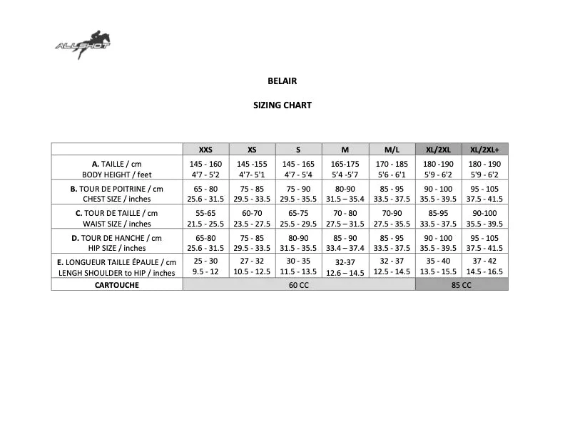 ALLSHOT Belair airbag vest is the second generation of the equestrian airbag and holds the latest AFNOR certification S72-800:2022. Meant to be fitted, this vest allies safety and elegance. Belair is compatible with ANY zipped jacket that has a minimum of 15% elastane. Belair is the most performant vest on the market and deploys in 80ms regardless of the size vest. The minimum weight of the rider is 66 pounds. This vest is mostly designed for dressage, hunter, and jumper riders. Belair is sold ready to wear with a D3O back protector, a saddle strap, 2 CO2 cartridges