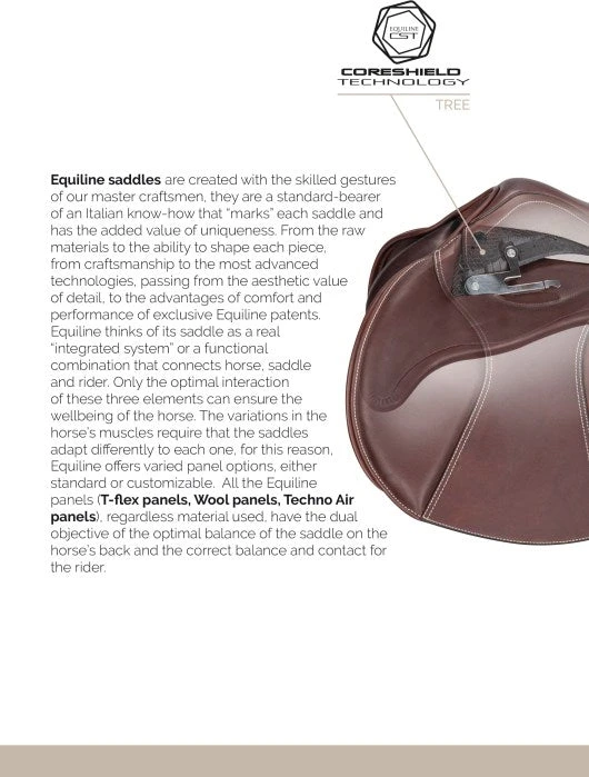 Designed for a more open hip angle with a longer leg, the American Hunter features a narrow twist with a slightly wider seat. The saddle boasts a molded, padded flap with T-foam, along with removable knee and thigh blocks, bottom flap leather reinforcement, and Equiline’s stirrup bar locking system. The Stirrup bar is fixed 2 cm backward compared with other saddles. Includes an embossed Equiline logo for a classical look.